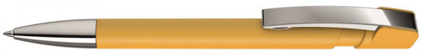 Druckkugelschreiber mit gummiertem Gehäuse, flexiblem Metallclip und schwere Metallspitze glanzverchromt.