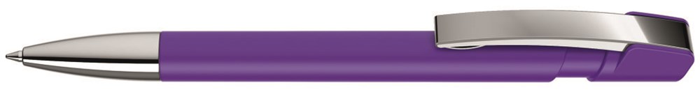 Druckkugelschreiber mit gummiertem Gehäuse, flexiblem Metallclip und schwere Metallspitze glanzverchromt.