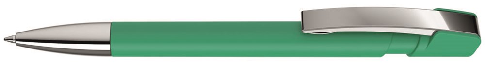 Druckkugelschreiber mit gummiertem Gehäuse, flexiblem Metallclip und schwere Metallspitze glanzverchromt.