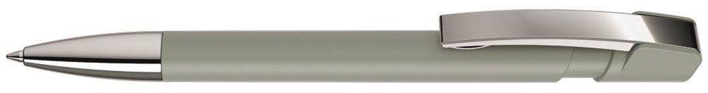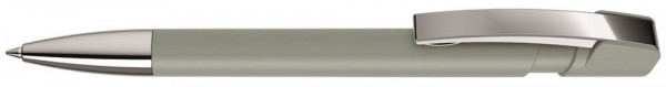 Druckkugelschreiber mit gummiertem Gehäuse, flexiblem Metallclip und schwere Metallspitze glanzverchromt.