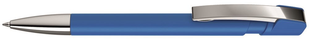 Druckkugelschreiber mit gummiertem Gehäuse, flexiblem Metallclip und schwere Metallspitze glanzverchromt.