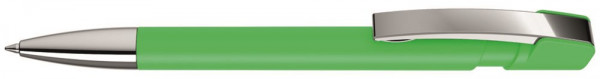 Druckkugelschreiber mit gummiertem Gehäuse, flexiblem Metallclip und schwere Metallspitze glanzverchromt.