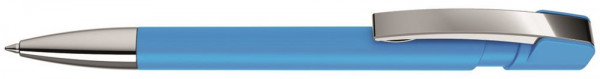 Druckkugelschreiber mit gummiertem Gehäuse, flexiblem Metallclip und schwere Metallspitze glanzverchromt.
