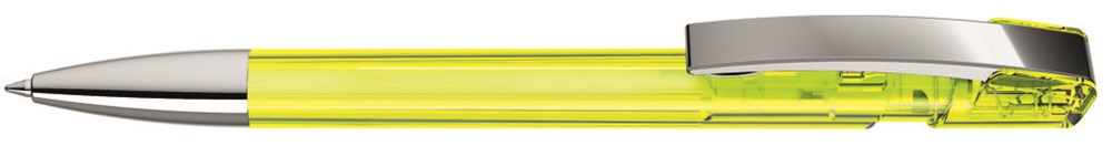 Druckkugelschreiber mit transparent glänzendem Gehäuse unifarben, Metallclip und schwerer Metallspitze glanzverchromt.