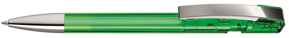 Druckkugelschreiber mit transparent glänzendem Gehäuse unifarben, Metallclip und schwerer Metallspitze glanzverchromt.