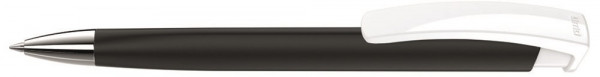Druckkugelschreiber mit gummiertem Dreikantgehäuse und weiß gedeckt glänzendem Clip und schwerer Metallspitze glanzverchromt.