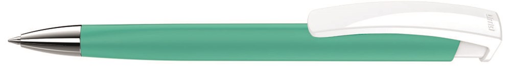Druckkugelschreiber mit gummiertem Dreikantgehäuse und weiß gedeckt glänzendem Clip und schwerer Metallspitze glanzverchromt.