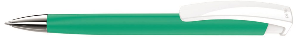 Druckkugelschreiber mit gummiertem Dreikantgehäuse und weiß gedeckt glänzendem Clip und schwerer Metallspitze glanzverchromt.