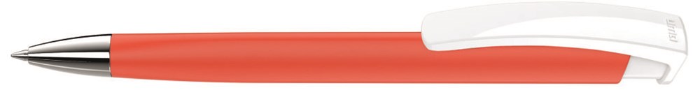 Druckkugelschreiber mit gummiertem Dreikantgehäuse und weiß gedeckt glänzendem Clip und schwerer Metallspitze glanzverchromt.