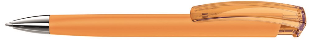 Druckkugelschreiber mit gummiertem Dreikantgehäuse, transparent glänzendem Clip und mit schwerer Metallspitze glanzverchromt.