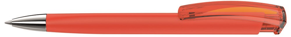 Druckkugelschreiber mit gummiertem Dreikantgehäuse, transparent glänzendem Clip und mit schwerer Metallspitze glanzverchromt.