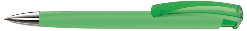 Druckkugelschreiber mit gummiertem Dreikantgehäuse, transparent glänzendem Clip und mit schwerer Metallspitze glanzverchromt.