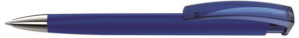 Druckkugelschreiber mit gummiertem Dreikantgehäuse, transparent glänzendem Clip und mit schwerer Metallspitze glanzverchromt.