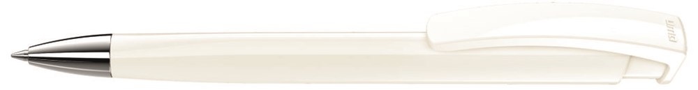 Druckkugelschreiber mit gedeckt glänzendem Dreikantgehäuse und schwerer Metallspitze glanzverchromt.