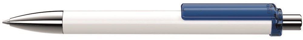 Druckkugelschreiber mit gedeckt glänzendem Schaft in weiß oder schwarz, Clip transparent glänzend. Metallspitze und Metalldrücker glanzverchromt.