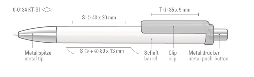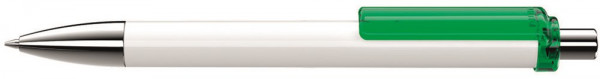 Druckkugelschreiber mit gedeckt glänzendem Schaft in weiß oder schwarz, Clip transparent glänzend. Metallspitze und Metalldrücker glanzverchromt.