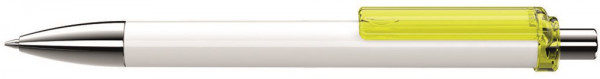 Druckkugelschreiber mit gedeckt glänzendem Schaft in weiß oder schwarz, Clip transparent glänzend. Metallspitze und Metalldrücker glanzverchromt.