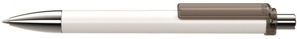 Druckkugelschreiber mit gedeckt glänzendem Schaft in weiß oder schwarz, Clip transparent glänzend. Metallspitze und Metalldrücker glanzverchromt.
