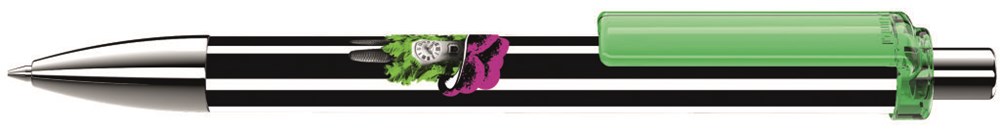 Druckkugelschreiber FASHION KT-SI mit digitalem Folientransferdruck auf dem Schaft, Clip transparent glänzend. Metallspitze und Metalldrücker glanzverchromt.