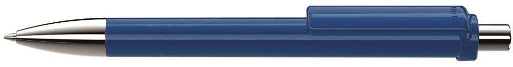 Druckkugelschreiber mit gedeckt glänzendem Gehäuse. Metallspitze und Metalldrücker glanzverchromt.