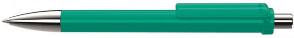 Druckkugelschreiber mit gedeckt glänzendem Gehäuse. Metallspitze und Metalldrücker glanzverchromt.