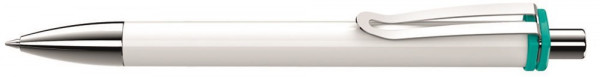 Druckkugelschreiber mit gedeckt glänzendem Gehäuse in weiß oder schwarz und farbiger Clipaufhängung. Breiter Metallbiegeclip, Metallspitze und Metalldrücker glanzverchromt. Minentype: uma Tech Refill 1.0, schwarzes Rohr Minenfarbe: blau
