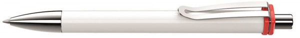 Druckkugelschreiber mit gedeckt glänzendem Gehäuse in weiß oder schwarz und farbiger Clipaufhängung. Breiter Metallbiegeclip, Metallspitze und Metalldrücker glanzverchromt.