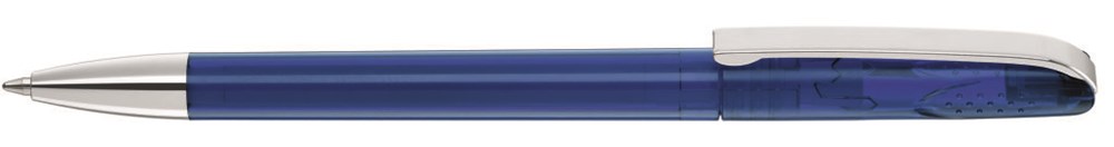 Drehkugelschreiber mit glänzend transparentem Gehäuse, schwerer glänzender Metallspitze und Metallclip. Griffnoppen in der Kappe unterstützen den komfortablen Drehmachanismus.