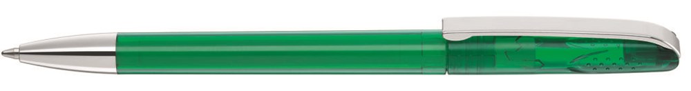 Drehkugelschreiber mit glänzend transparentem Gehäuse, schwerer glänzender Metallspitze und Metallclip. Griffnoppen in der Kappe unterstützen den komfortablen Drehmachanismus.