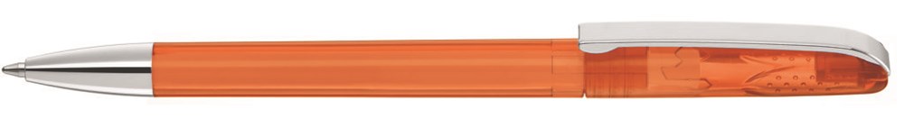 Drehkugelschreiber mit glänzend transparentem Gehäuse, schwerer glänzender Metallspitze und Metallclip. Griffnoppen in der Kappe unterstützen den komfortablen Drehmachanismus.