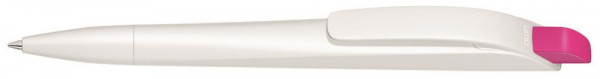 Druckkugelschreiber mit geometrisch wechselnder Schaftform. Gehäuse mit Bogenclip unifarben matt gedeckt in schwarz oder weiß mit farbigem Drücker.