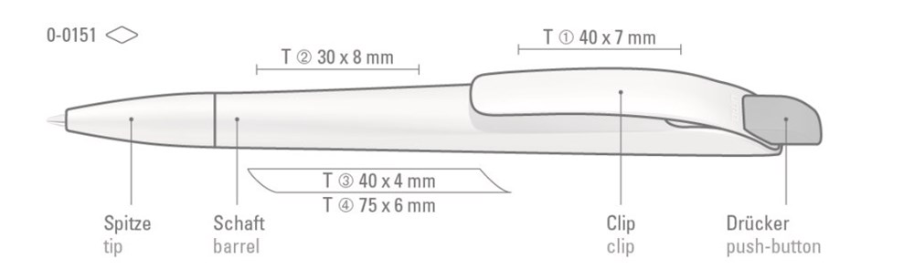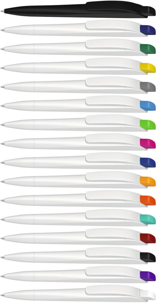 Druckkugelschreiber mit geometrisch wechselnder Schaftform. Gehäuse mit Bogenclip unifarben matt gedeckt in schwarz oder weiß mit farbigem Drücker.