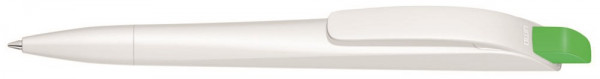 Druckkugelschreiber mit geometrisch wechselnder Schaftform. Gehäuse mit Bogenclip unifarben matt gedeckt in schwarz oder weiß mit farbigem Drücker.