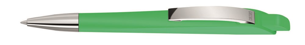 Druckkugelschreiber mit geometrisch wechselnder, Schaftform und Metallclip und Metallspitze glanzverchromt.