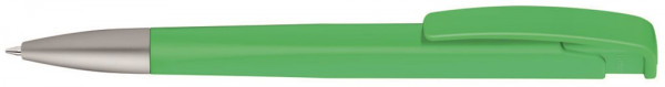 Druckkugelschreiber mit geometrisch wechselnder Schaftform, matt gedecktem Gehäuse und Metallspitze matt verchromt.