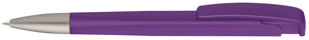 Druckkugelschreiber mit geometrisch wechselnder Schaftform, matt gedecktem Gehäuse und Metallspitze matt verchromt.