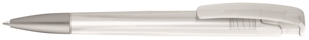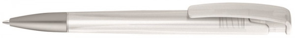 Druckkugelschreiber mit geometrisch wechselnder Schaftform, transparent gefrostetem Gehäuse und Metallspitze matt verchromt.