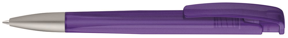 Druckkugelschreiber mit geometrisch wechselnder Schaftform, transparent gefrostetem Gehäuse und Metallspitze matt verchromt.