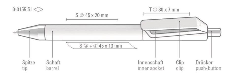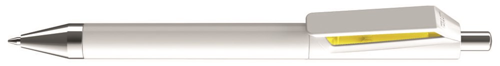 Druckkugelschreiber mit weiß gedeckt glänzendem und farbig transparent glänzendem Innenschaft bzw. uni weiß oder schwarz. Spitze und Drücker in silber glänzend.