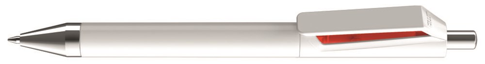 Druckkugelschreiber mit weiß gedeckt glänzendem und farbig transparent glänzendem Innenschaft bzw. uni weiß oder schwarz. Spitze und Drücker in silber glänzend.