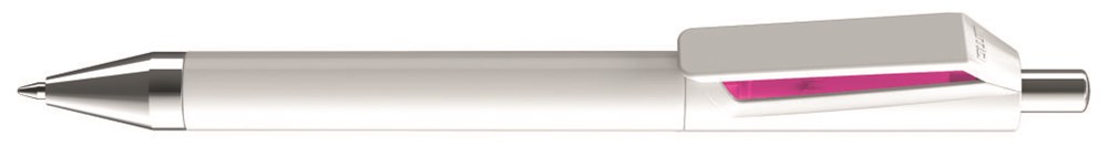 Druckkugelschreiber mit weiß gedeckt glänzendem und farbig transparent glänzendem Innenschaft bzw. uni weiß oder schwarz. Spitze und Drücker in silber glänzend.