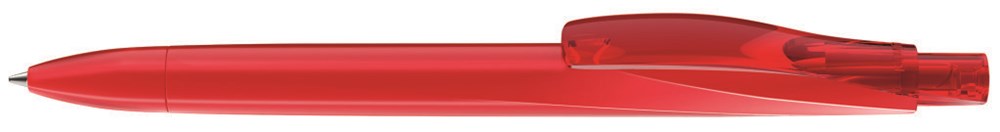 Druckkugelschreiber mit geometrisch wechselnder Schaftform. Gedeckt glänzender Schaft und Spitze, Clip und Drücker transparent glänzend.