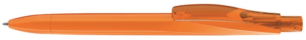 Druckkugelschreiber mit geometrisch wechselnder Schaftform. Gedeckt glänzender Schaft und Spitze, Clip und Drücker transparent glänzend.