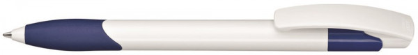 Druckkugelschreiber mit Gummigriffzone und Manschette unifarben. Schaft und Clipdrücker in weiß. Ab 2.000 Stück kann das Modell farblich kombiniert werden.