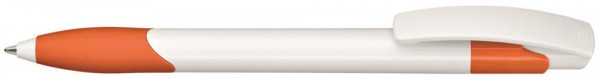 Druckkugelschreiber mit Gummigriffzone und Manschette unifarben. Schaft und Clipdrücker in weiß. Ab 2.000 Stück kann das Modell farblich kombiniert werden.