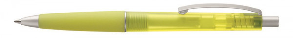 Druckkugelschreiber mit transparent gefrostetem Schaft und Gummigriffzone. Geschwungener Metallclip. Drücker, Zierring und Spitze in matt silber.