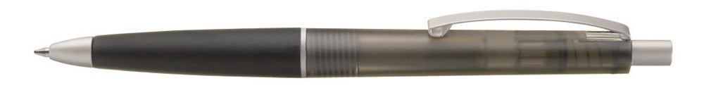 Druckkugelschreiber mit transparent gefrostetem Schaft und Gummigriffzone. Geschwungener Metallclip. Drücker, Zierring und Spitze in matt silber.