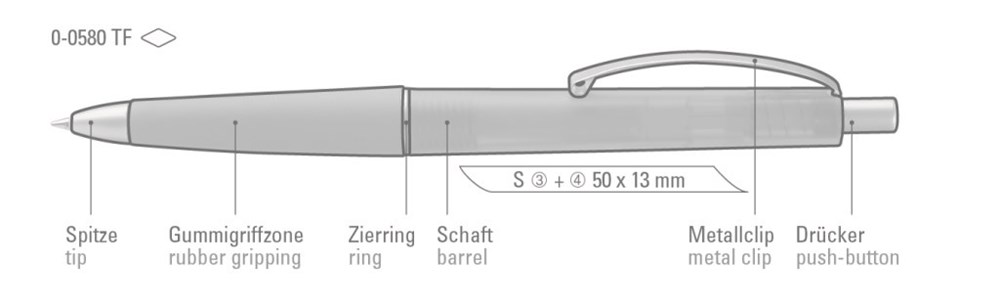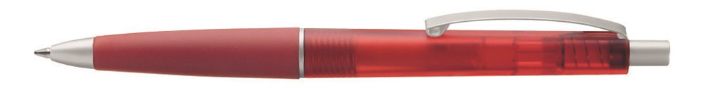 Druckkugelschreiber mit transparent gefrostetem Schaft und Gummigriffzone. Geschwungener Metallclip. Drücker, Zierring und Spitze in matt silber.
