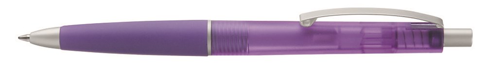 Druckkugelschreiber mit transparent gefrostetem Schaft und Gummigriffzone. Geschwungener Metallclip. Drücker, Zierring und Spitze in matt silber.