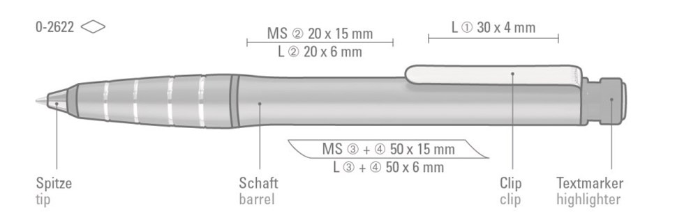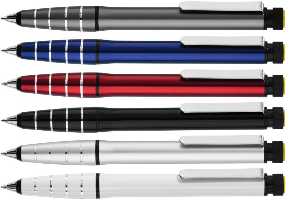 Metall-Drehkugelschreiber aus Aluminium mit integriertem gelb schreibendem Textmarker im Schaft. Der Textmarker lässt sich mittels Drehbewegung aus dem Schaft herausnehmen und kann separat genutzt werden. Minentype: uma D1 Refill Minenfarbe: blau